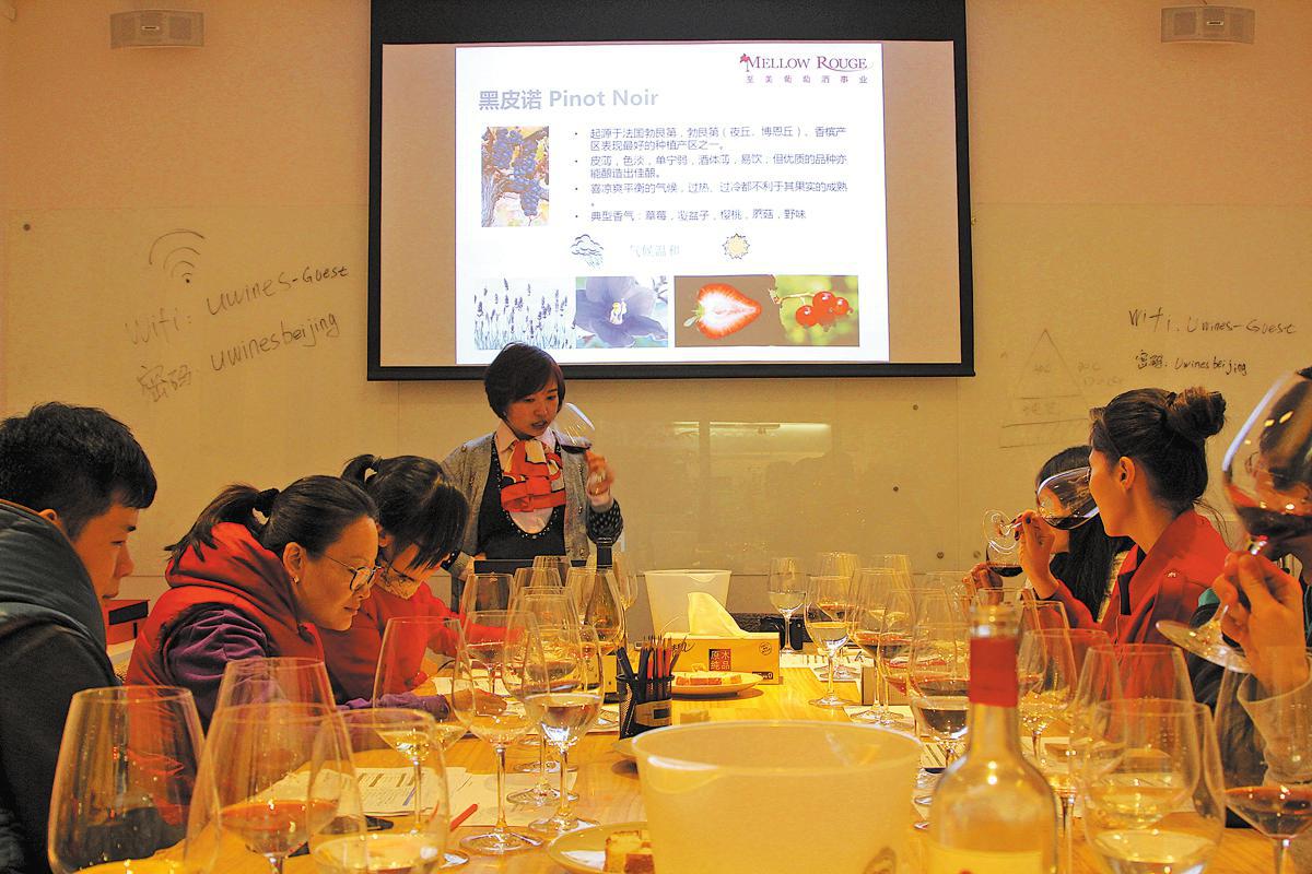 Tina Tian, founder of Beijing Mellow Rouge Trading, teaches a wine tasting class in Beijing. (Photo/China Daily)