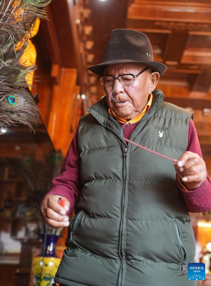 Losang burns incense at home in Doilungdeqen District of Lhasa, southwest China's Xizang Autonomous Region, March 20, 2025. (Xinhua/Jigme Dorje)