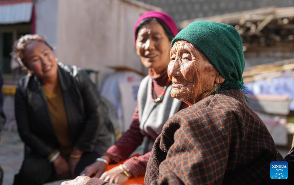 Monlam Sangmo (R) talks with her daughter and neighbor in her yard at home in Doilungdeqen District of Lhasa, southwest China's Xizang Autonomous Region, March 20, 2025. (Xinhua/Jigme Dorje)
