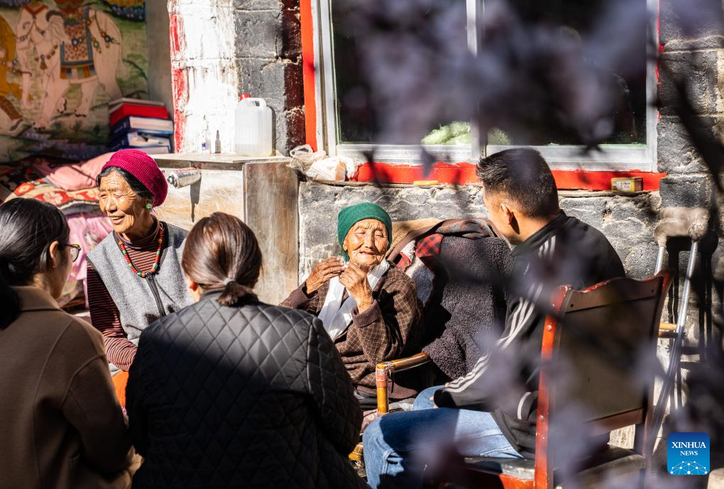 Monlam Sangmo (2nd R) talks with her daughter and neighbors in her yard at home in Doilungdeqen District of Lhasa, southwest China's Xizang Autonomous Region, March 20, 2025. (Xinhua/Jigme Dorje)