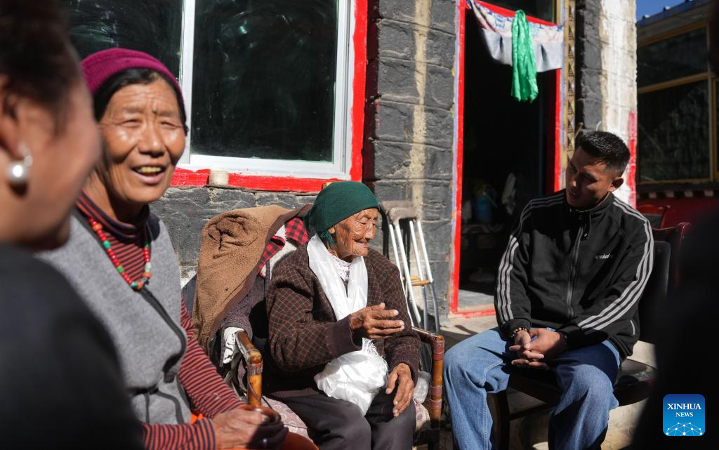 Monlam Sangmo (2nd R) talks with others in her yard at home in Doilungdeqen District of Lhasa, southwest China's Xizang Autonomous Region, March 20, 2025. (Xinhua/Tenzin Nyida)