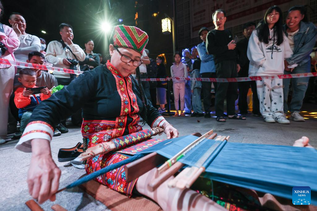 An inheritor of the intangible cultural heritage demonstrates the traditional weaving skills of Li ethnic group during a Sanyuesan celebration in Wuzhishan City of south China's Hainan Province, March 30, 2025. Local people held various events in Wuzhishan to celebrate the Sanyuesan Festival which falls on the third day of the third lunar month. (Xinhua/Zhang Liyun)