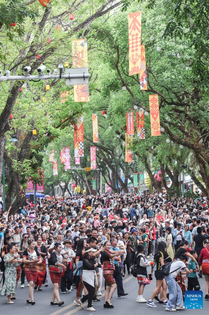 Tourists enjoy a feast during a Sanyuesan celebration in Wuzhishan City of south China's Hainan Province, March 30, 2025. Local people held various events in Wuzhishan to celebrate the Sanyuesan Festival which falls on the third day of the third lunar month. (Xinhua/Zhang Liyun)