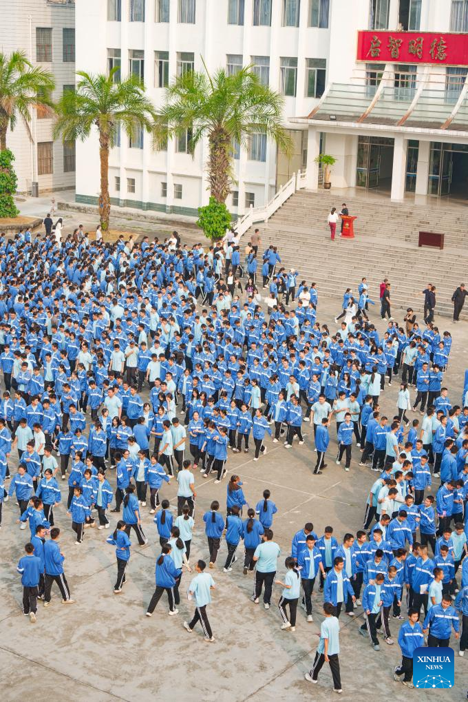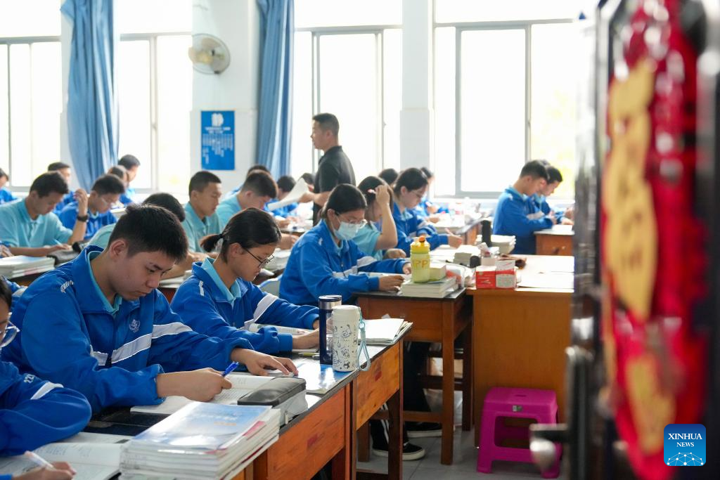 Students have a class at a middle school in Ruili, southwest China's Yunnan Province, March 31, 2025. All schools in Ruili have resumed teaching as of 9 a.m. Monday. Local authorities have completed the investigation of potential safety hazards of school buildings in the city. (Xinhua/Chen Xinbo)