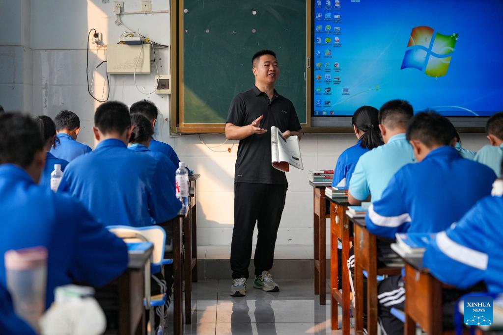 A teacher gives a lecture to the students at a middle school in Ruili, southwest China's Yunnan Province, March 31, 2025. All schools in Ruili have resumed teaching as of 9 a.m. Monday. Local authorities have completed the investigation of potential safety hazards of school buildings in the city. (Xinhua/Chen Xinbo)
