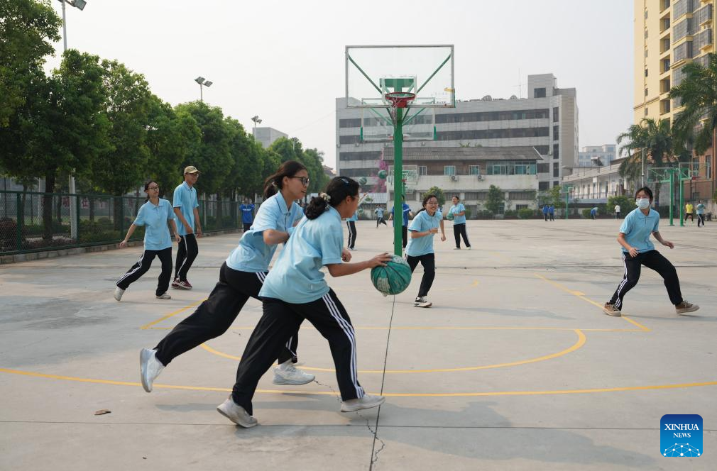 Students play basketball on the playground of a middle school in Ruili, southwest China's Yunnan Province, March 31, 2025. All schools in Ruili have resumed teaching as of 9 a.m. Monday. Local authorities have completed the investigation of potential safety hazards of school buildings in the city. (Xinhua/Chen Xinbo)