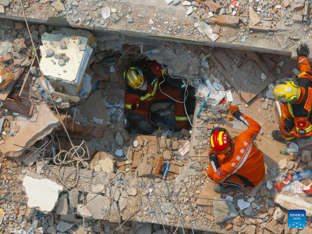 China Search and Rescue Team, assigned by the country's Ministry of Emergency Management, and a rescue team from China's Hong Kong carry out a joint search and rescue operation at the Sky Villa residence in Mandalay, Myanmar, April 1, 2025.