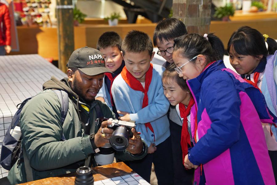 Jerald Devin Braddock Jr shows pictures to pupils at the Hangzhou Workmanship Demonstration Pavilion in Hangzhou, east China's Zhejiang Province, March 28, 2025. (Xinhua/Wang Ying)
