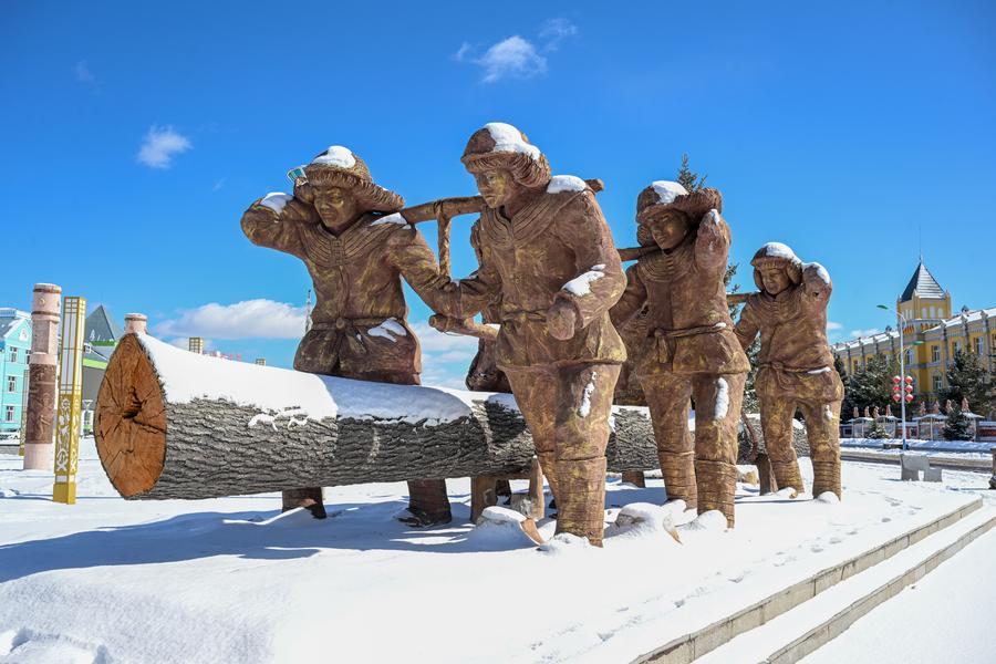 A statue depicting the work of loggers is pictured in Mordoga Town of Hulun Buir, north China's Inner Mongolia Autonomous Region, March 24, 2025. (Xinhua/Lian Zhen)