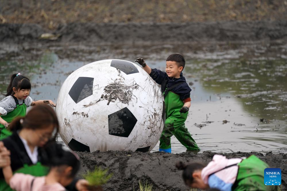 Children play in the rice field in Beidasi Village of Jinyuan District in Taiyuan, north China's Shanxi Province, May 4, 2024.
