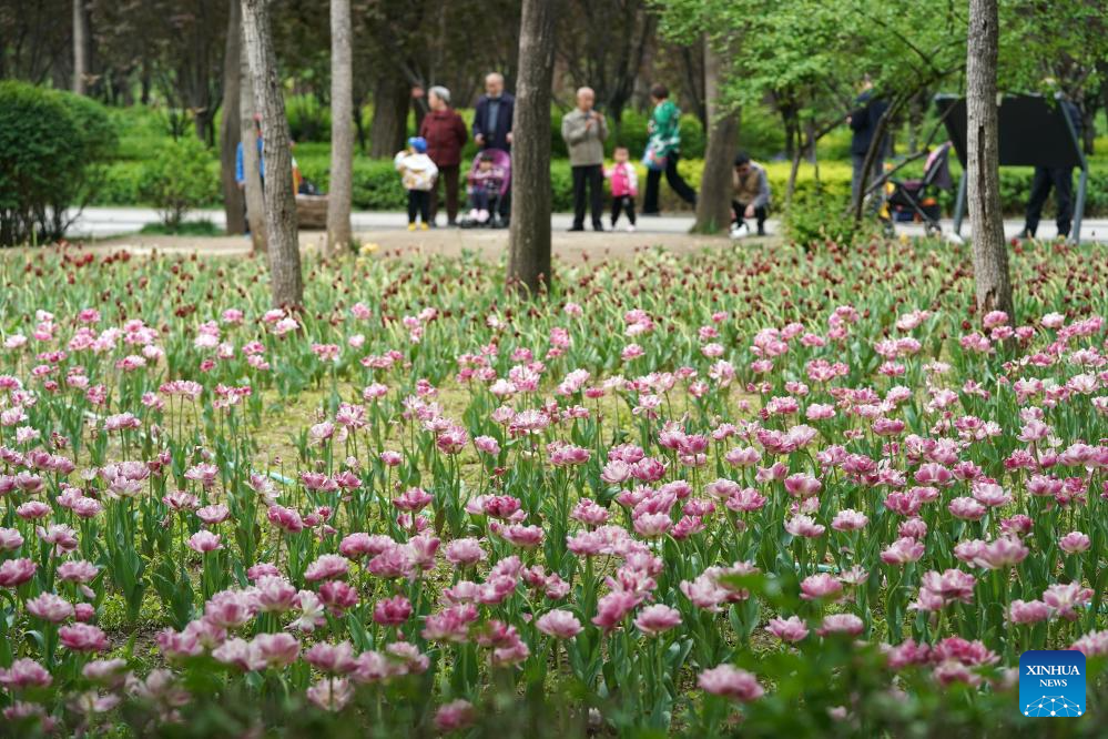 People enjoy flowers at a park in Yingze District of Taiyuan City, north China's Shanxi Province, May 10, 2023.