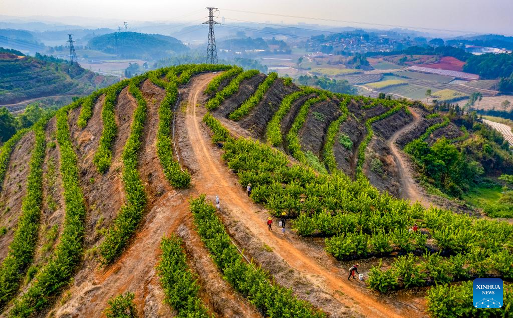 An aerial drone photo shows farmers working at a lemon planting base in Ruili, southwest China's Yunnan Province, March 31, 2025. Based on its unique natural advantages, Ruili has upgraded its lemon planting industry through large-scale planting, technology empowerment and the whole industrial chain.