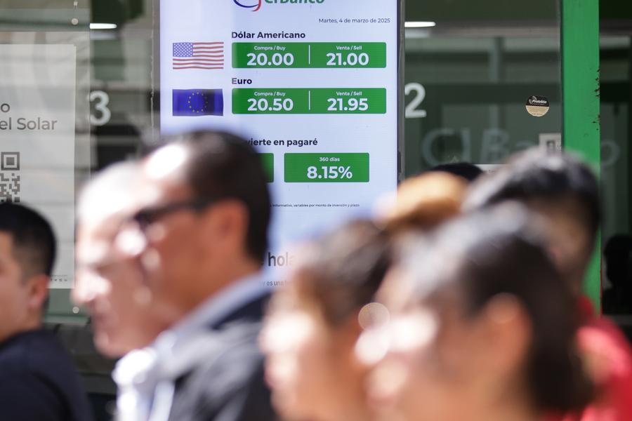 People walk past a sign displaying the dollar exchange rate at a bank branch in Mexico City, Mexico, on March 4, 2025. (Photo by Francisco Canedo/Xinhua)