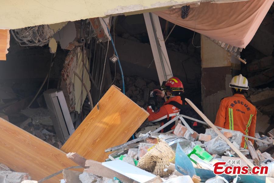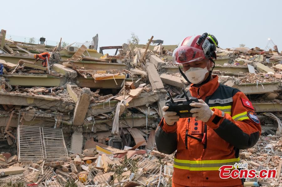 China Search and Rescue Team and a rescue team from China's Hong Kong Special Administrative Region carry out a joint search and rescue operation at the Sky Villa residence in Mandalay, Myanmar, April 1, 2025. (China News Service/Chen Yongnuo)