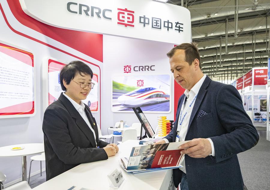 A visitor talks with a staff member at the exhibition booth of CRRC at Hannover Messe 2025 in Hannover, Germany, on March 31, 2025. (Xinhua/Zhang Fan)
