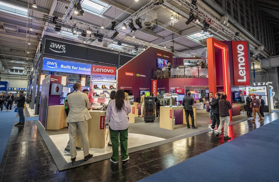 People visit the exhibition booth of Lenovo at Hannover Messe 2025 in Hannover, Germany, on March 31, 2025. (Xinhua/Zhang Fan)