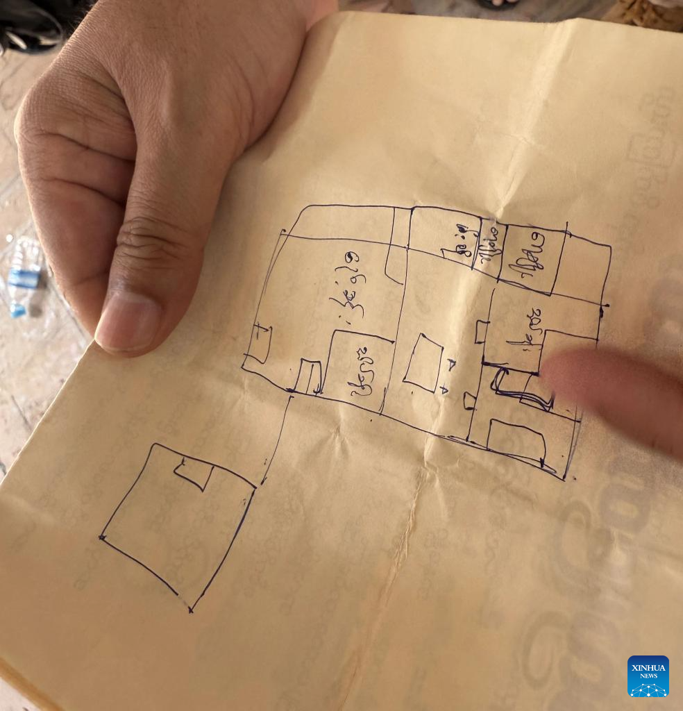 Father of Shin Shin draws a sketch of their home for the rescue team in Mandalay, Myanmar, April 1, 2025. China Search and Rescue Team, assigned by the country's Ministry of Emergency Management, and a rescue team from China's Hong Kong carried out a joint search and rescue operation for a missing child named Shin Shin at the Sky Villa residence on Tuesday. The 5-year-old girl has been missing since the earthquake last week. (Xinhua/Cai Yang)