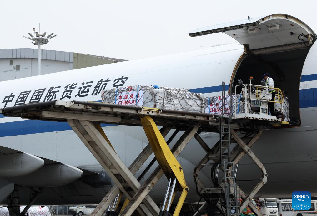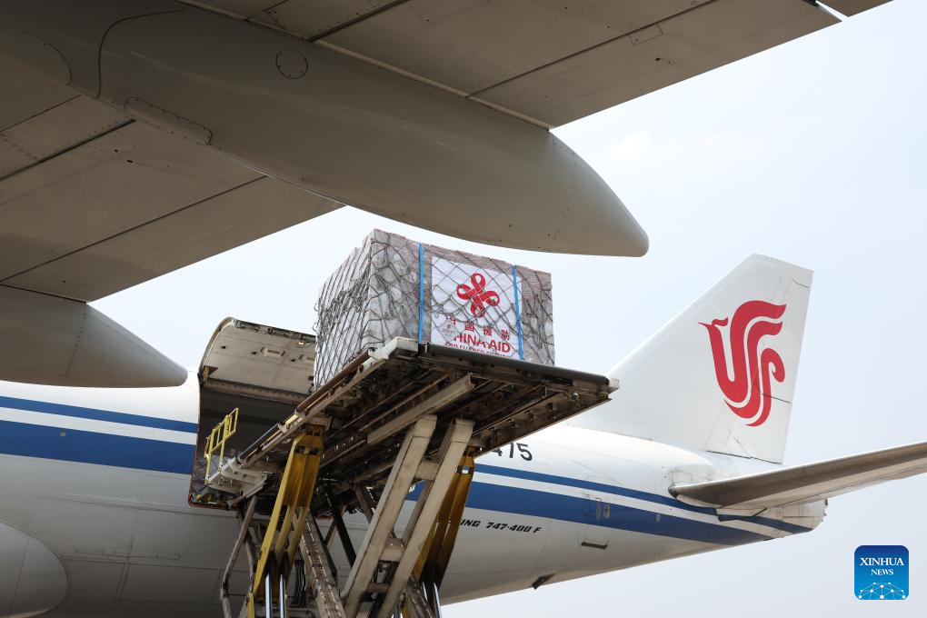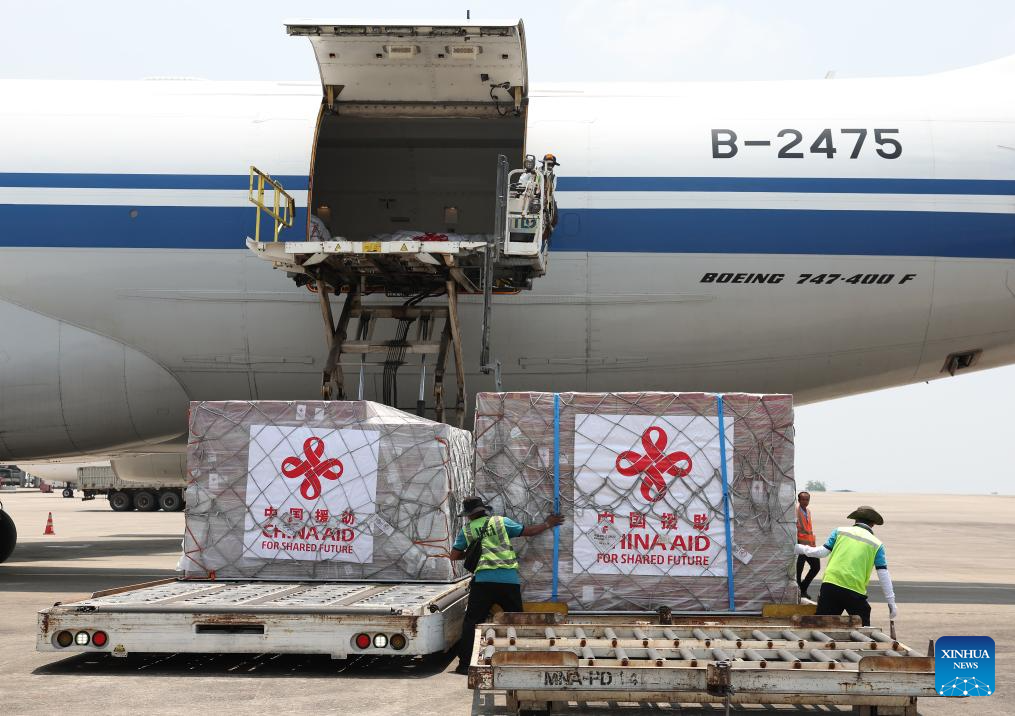 The second batch of emergency humanitarian aid supplies dispatched by the Chinese government arrives at Yangon International Airport in Yangon, Myanmar, April 3, 2025. (Xinhua/Jia Haocheng)