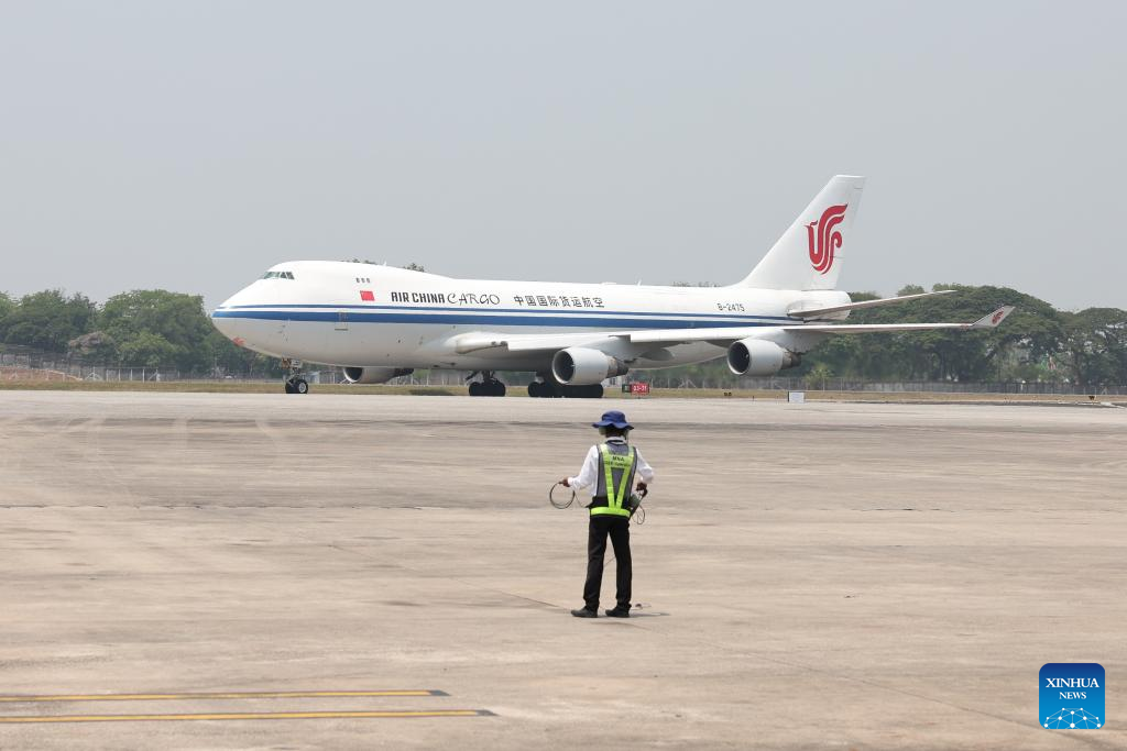 The second batch of emergency humanitarian aid supplies for earthquake disaster relief dispatched by the Chinese government arrives at Yangon International Airport in Yangon, Myanmar, April 3, 2025. (Xinhua/Jia Haocheng)