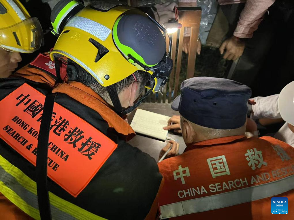A member of a rescue team from China's Hong Kong Special Administrative Region (HKSAR) (L) and a member of a volunteer team from China's Shenzhen city carry out search and rescue operations in Mandalay, Myanmar, April 2, 2025.