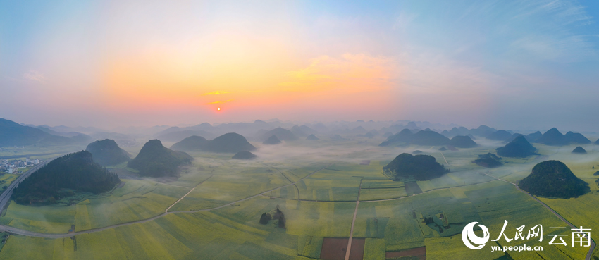 Rapeseed flowers blanket more than 1 million mu (666 square kilometers) of fields in Luoping county, Qujing city, southwest China's Yunnan Province. In the early hours, rolling mist veils the yellow blooms, forming a dramatic contrast with the surrounding mountain ridges. The county is China's leading rapeseed producer.