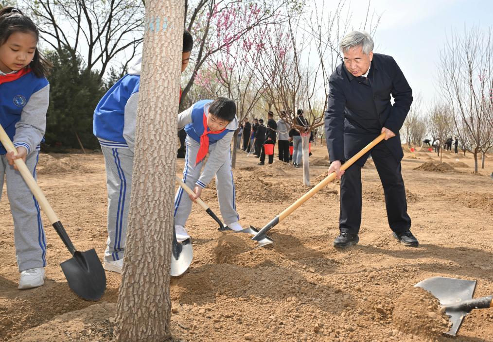 Li Xi plants a tree during a voluntary tree planting activity in Fengtai District of Beijing, capital of China, April 3, 2025. Party and state leaders Xi Jinping, Li Qiang, Zhao Leji, Wang Huning, Cai Qi, Ding Xuexiang, Li Xi, and Han Zheng, arrived at the tree planting site on the bank of a river in Fengtai District on Thursday morning and planted trees with officials and local people. (Xinhua/Yue Yuewei)