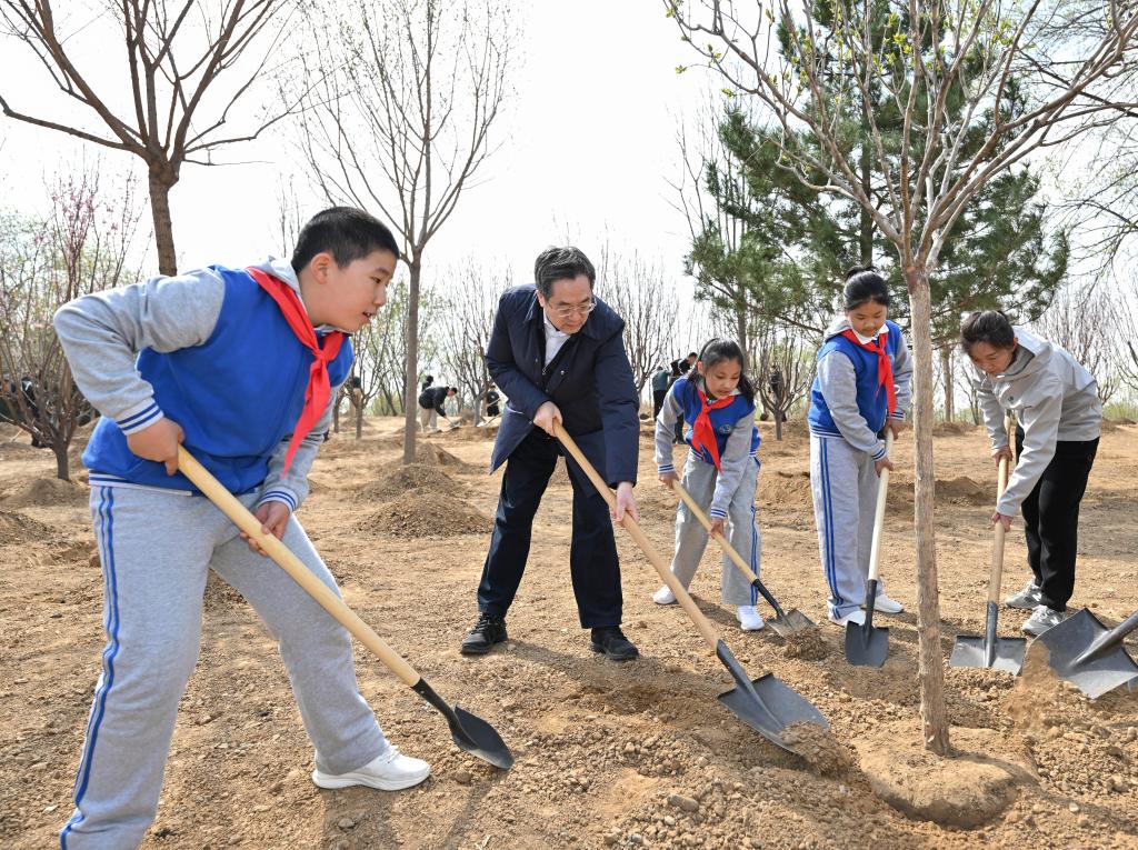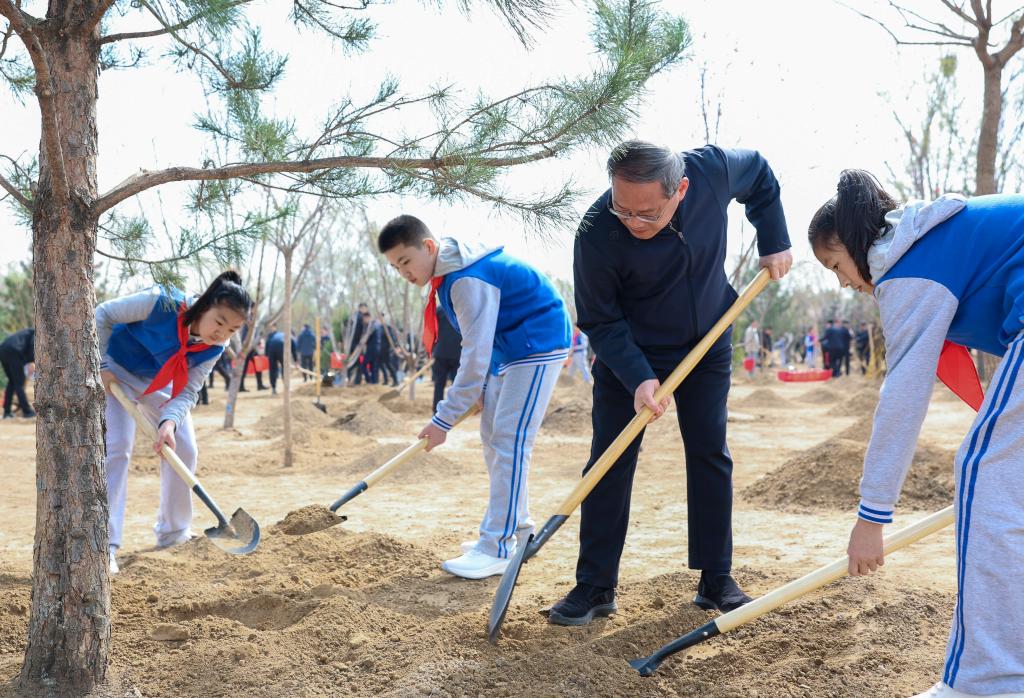 Li Qiang plants a tree during a voluntary tree planting activity in Fengtai District of Beijing, capital of China, April 3, 2025. Party and state leaders Xi Jinping, Li Qiang, Zhao Leji, Wang Huning, Cai Qi, Ding Xuexiang, Li Xi, and Han Zheng, arrived at the tree planting site on the bank of a river in Fengtai District on Thursday morning and planted trees with officials and local people. (Xinhua/Liu Bin)