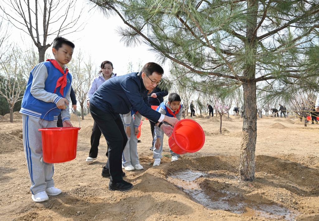 Chinese President Xi Jinping, also general secretary of the Communist Party of China Central Committee and chairman of the Central Military Commission, waters a tree with children during a voluntary tree planting activity in Fengtai District of Beijing, capital of China, April 3, 2025. Xi and other Party and state leaders, including Li Qiang, Zhao Leji, Wang Huning, Cai Qi, Ding Xuexiang, Li Xi, and Han Zheng, arrived at the tree planting site on the bank of a river in Fengtai District on Thursday morning and planted trees with officials and local people. (Xinhua/Xie Huanchi)