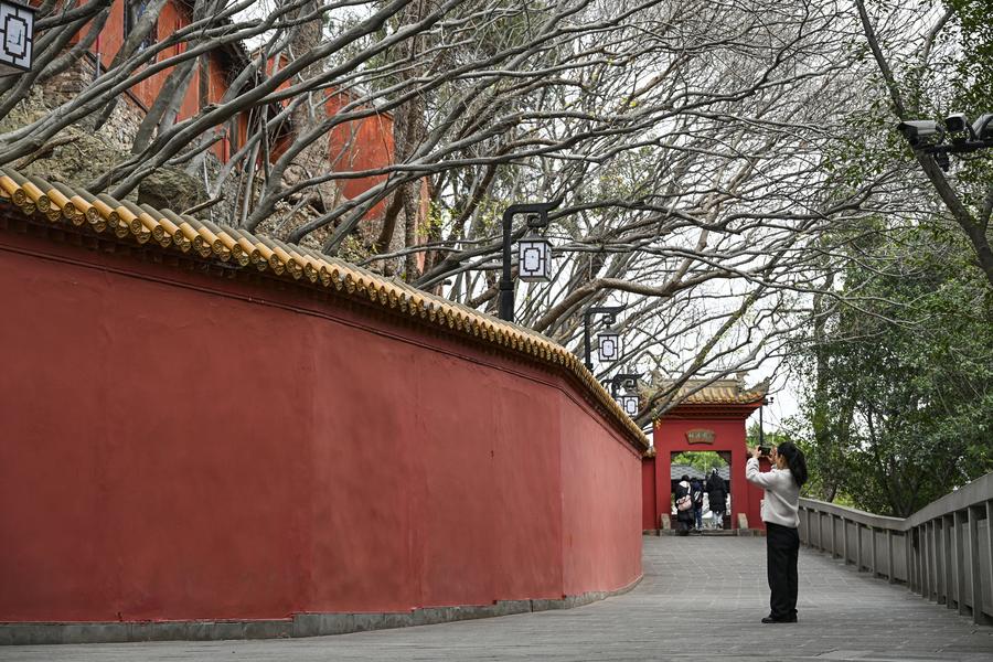 A tourist takes photos at the ancient town of Baidi in Fengjie County, southwest China's Chongqing Municipality, Feb. 13, 2025. (Xinhua/Wang Quanchao)