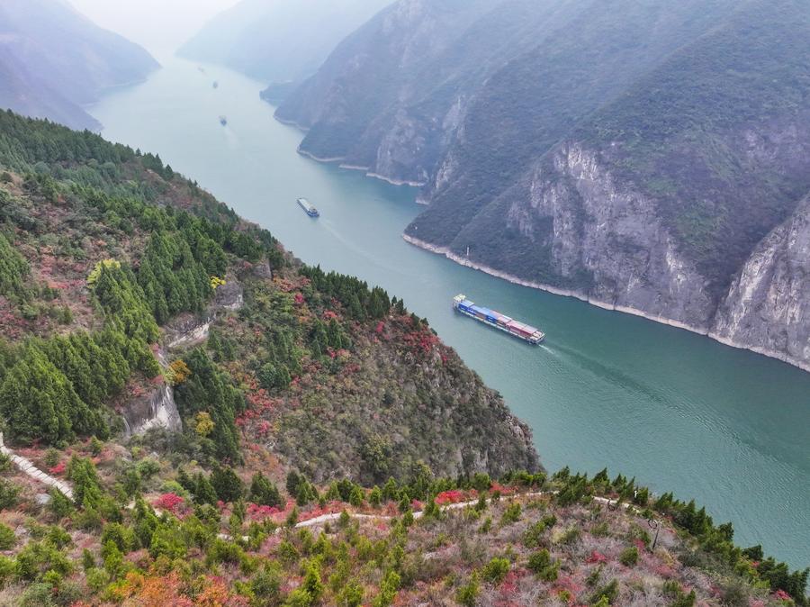 An aerial drone photo shows ships sailing in Qutang Gorge, one of the Three Gorges on the Yangtze River, in Fengjie County, southwest China's Chongqing Municipality, Dec. 19, 2024. (Xinhua/Wang Quanchao)