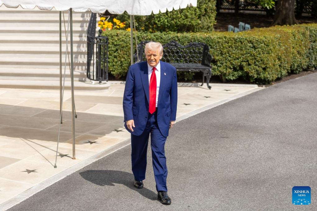 This photo taken on April 3, 2025 shows the U.S. President Donald Trump at the White House in Washington, D.C., the United States. Trump said on social media Friday that he would grant ByteDance an additional 75-day extension to either sell the popular video-sharing app TikTok to a non-Chinese company or risk being banned in the United States. (Xinhua/Hu Yousong)