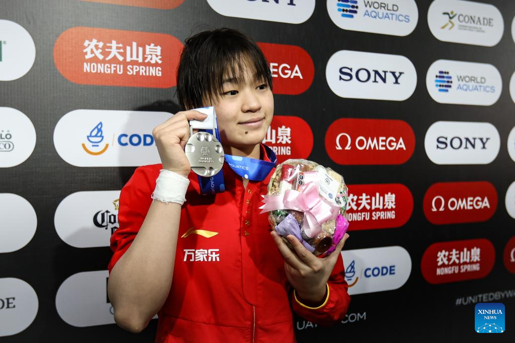 Silver medalist Quan Hongchan of China poses after the awarding ceremony for the women 10m platform final at the World Aquatics Diving World Cup 2025 in Guadalajara, Jalisco, Mexico, on April 5, 2025. (Photo by Diana Marquez/Xinhua)