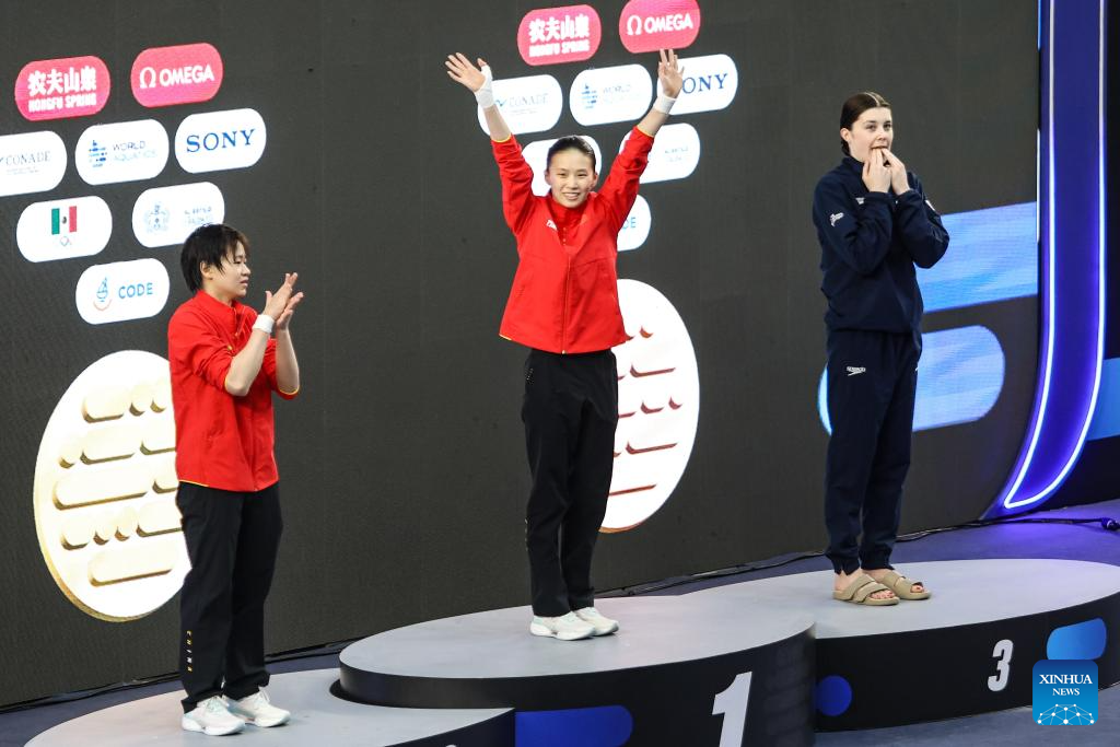 Gold medalist Chen Yuxi (C), silver medalist Quan Hongchan (L) of China and bronze medalist Andrea Spendolini Sirieix of Britain react during the awarding ceremony for the women 10m platform final at the World Aquatics Diving World Cup 2025 in Guadalajara, Jalisco, Mexico, on April 5, 2025. (Photo by Diana Marquez/Xinhua)