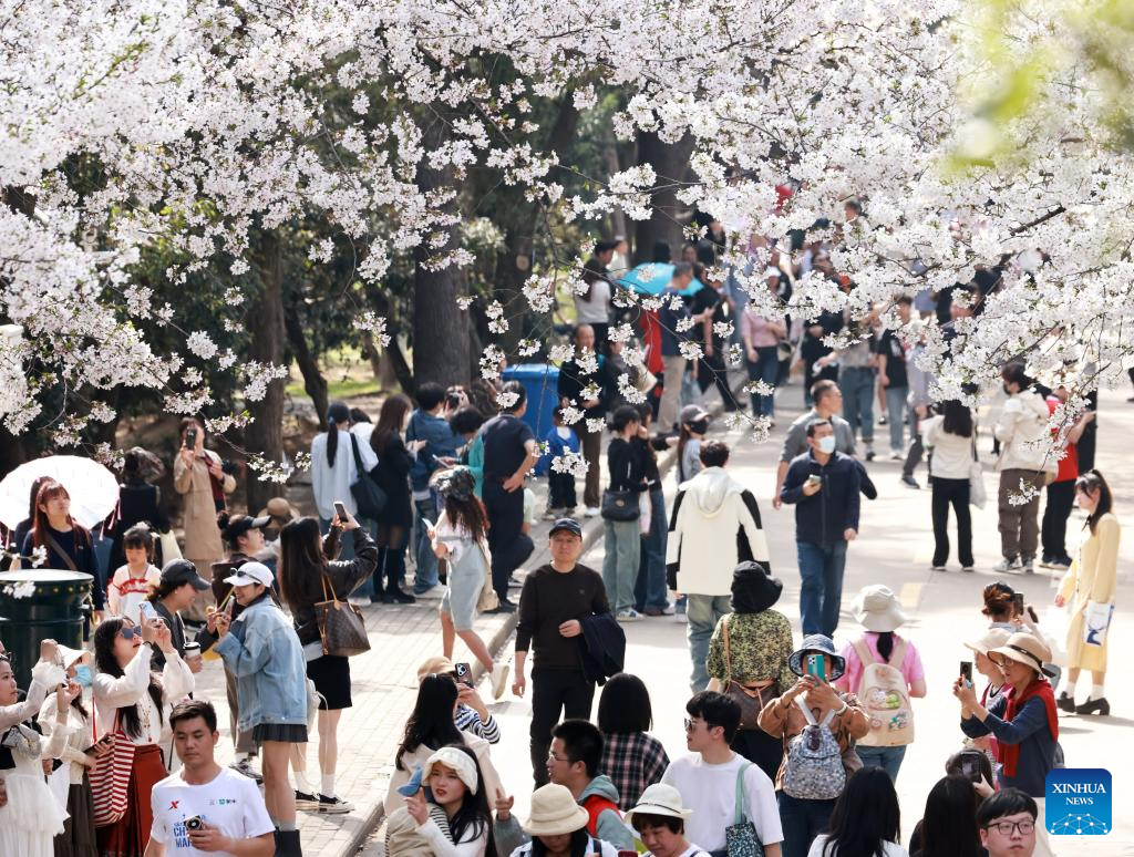 People enjoy cherry blossoms at Wuhan University in Wuhan, capital of central China's Hubei Province, March 22, 2025. (Xinhua/Wu Zhizun)