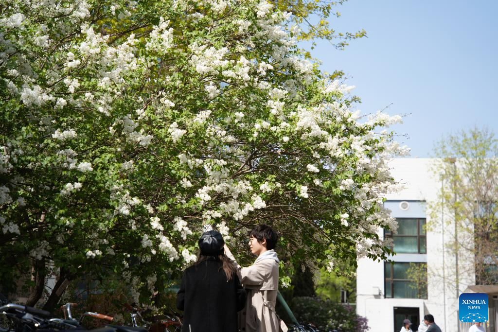 People take photos of blossoms at Beijing Forestry University in Beijing, capital of China, April 4, 2025. (Photo by Zhou Tinglu/Xinhua)