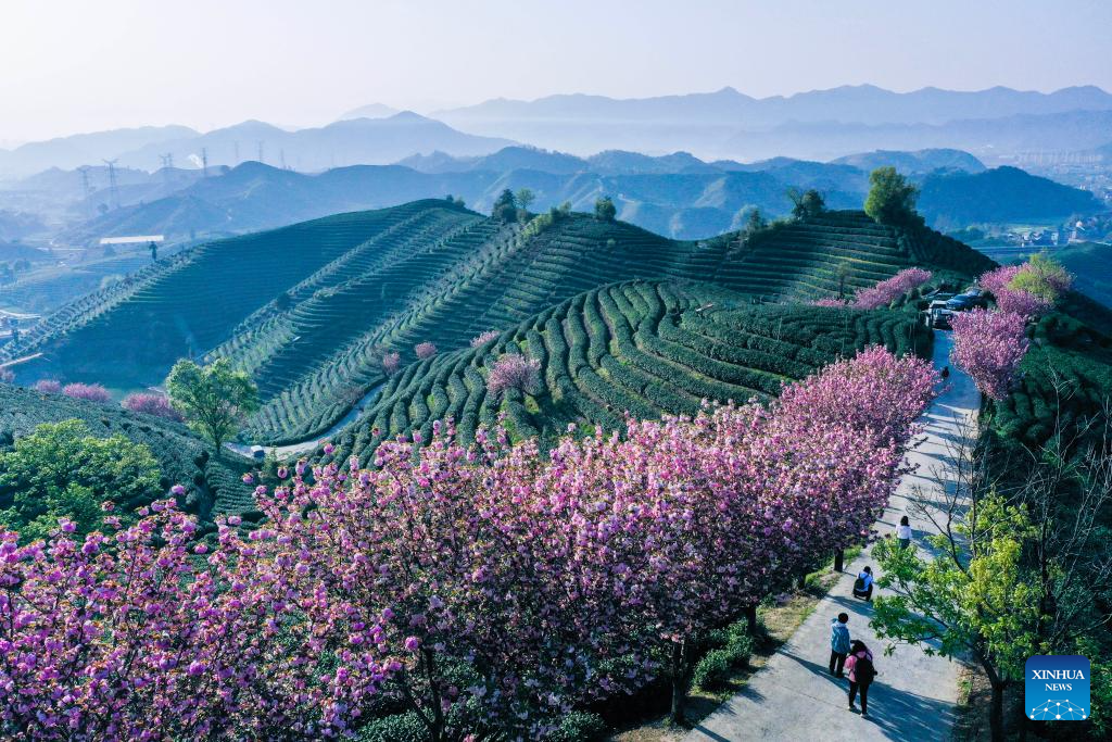 This photo taken on April 6, 2025 shows cherry blossoms at a tea garden in Bashan Village, Fuyang District of Hangzhou City, east China's Zhejiang Province. Cherry trees in the vast tea plantations on the mountains in Baishan Village are in full bloom, which attract lots of tourists. (Xinhua/Xu Yu)