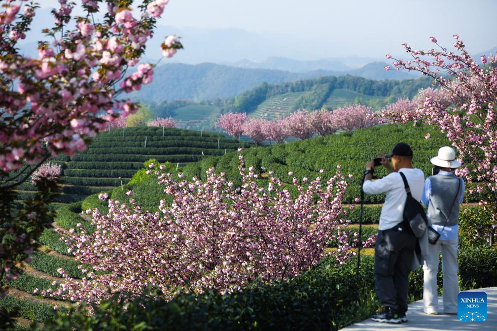 Tourists view cherry blossoms at a tea garden in Bashan Village, Fuyang District of Hangzhou City, east China's Zhejiang Province, April 6, 2025. Cherry trees in the vast tea plantations on the mountains in Baishan Village are in full bloom, which attract lots of tourists. (Xinhua/Xu Yu)
