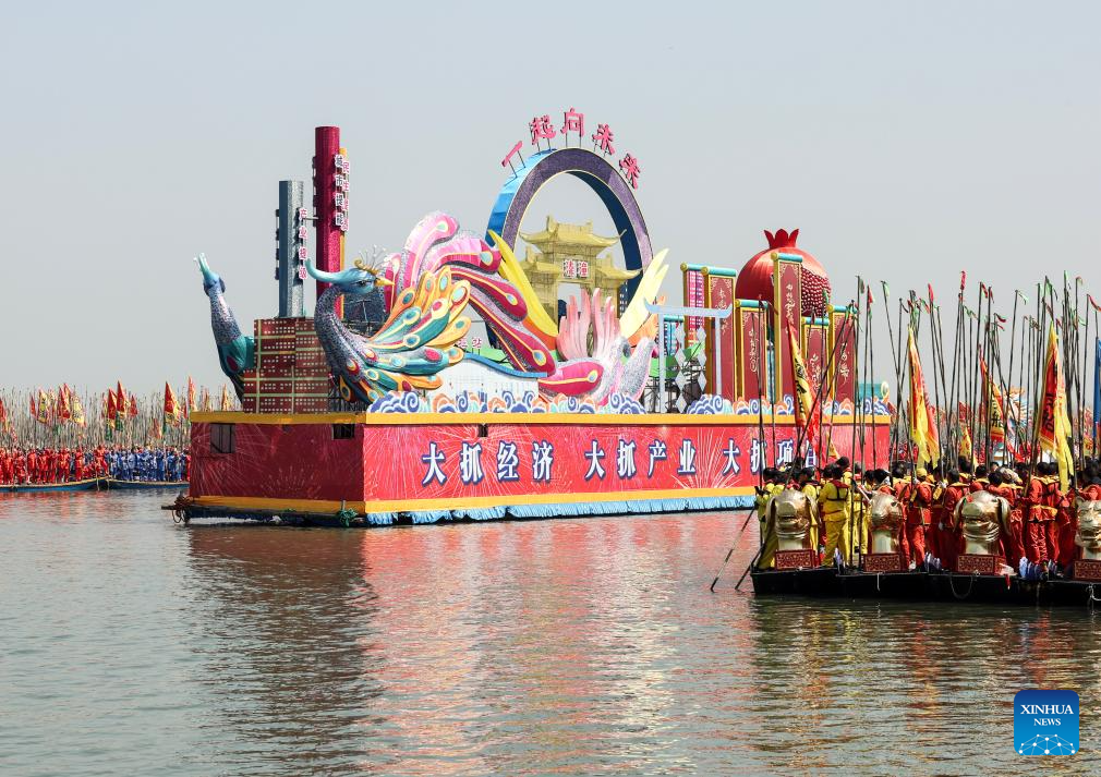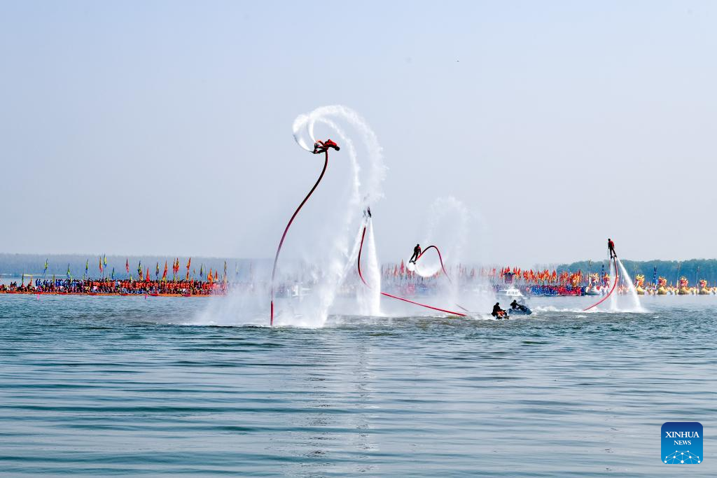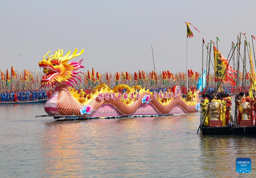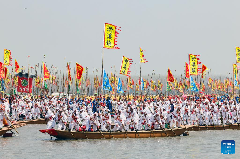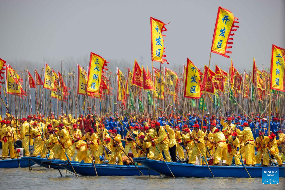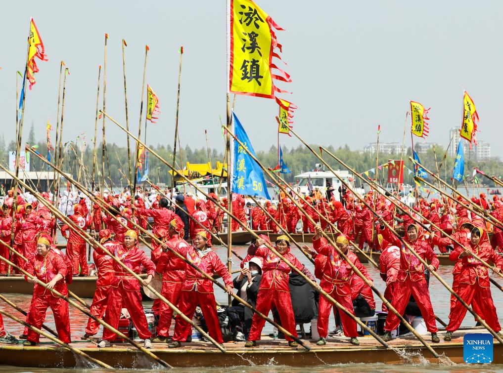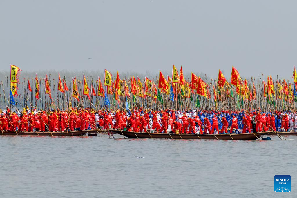 People participate in a boat performance during the 2025 Qintong Boat Festival held at Qinhu National Wetland Park in Jiangyan District of Taizhou, east China's Jiangsu Province on April 6, 2025. Over five hundred boats with more than 10,000 boat team members aboard gathered here on Sunday for the Qintong Boat Festival, which has been a centuries-old tradition. The Qintong Boat Festival was listed as the state-level intangible cultural heritage in 2008. (Photo by Lan Hongguang/Xinhua)