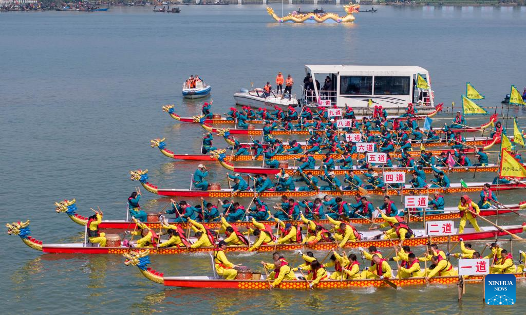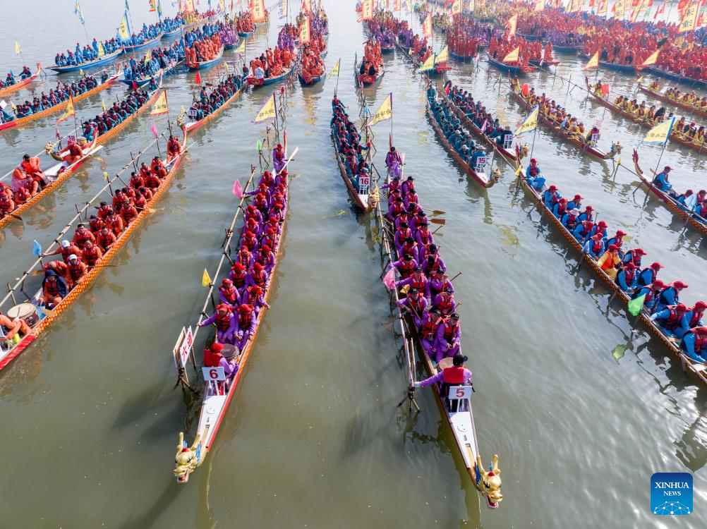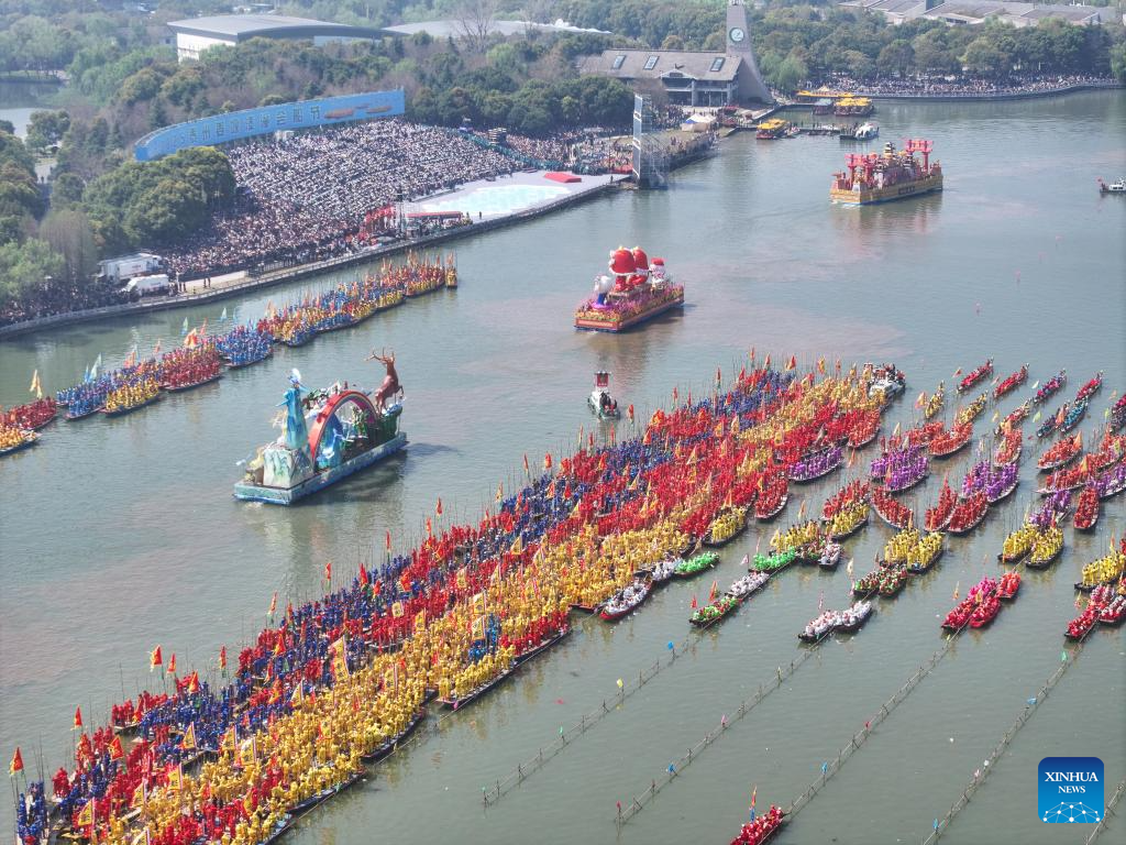 An aerial drone photo taken on April 6, 2025 shows people gathering for the 2025 Qintong Boat Festival held at Qinhu National Wetland Park in Jiangyan District of Taizhou, east China's Jiangsu Province. Over five hundred boats with more than 10,000 boat team members aboard gathered here on Sunday for the Qintong Boat Festival, which has been a centuries-old tradition. The Qintong Boat Festival was listed as the state-level intangible cultural heritage in 2008. (Xinhua/Ji Chunpeng)