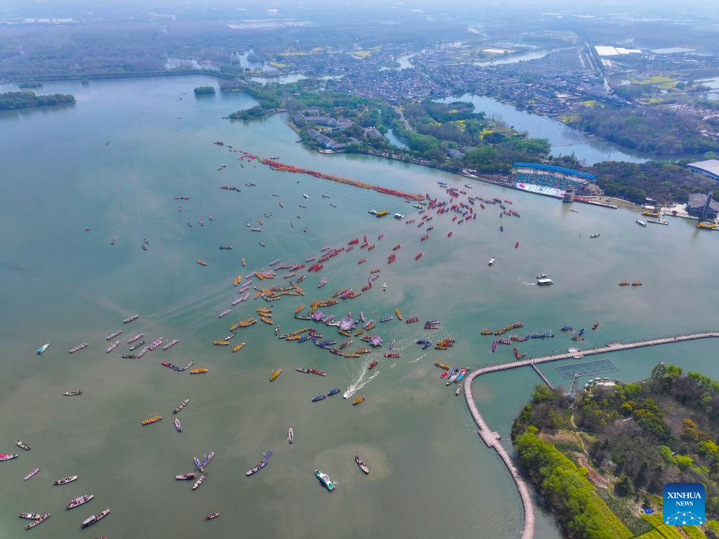 An aerial drone photo taken on April 6, 2025 shows a scene during the 2025 Qintong Boat Festival held at Qinhu National Wetland Park in Jiangyan District of Taizhou, east China's Jiangsu Province. Over five hundred boats with more than 10,000 boat team members aboard gathered here on Sunday for the Qintong Boat Festival, which has been a centuries-old tradition. The Qintong Boat Festival was listed as the state-level intangible cultural heritage in 2008. (Xinhua/Ji Chunpeng)