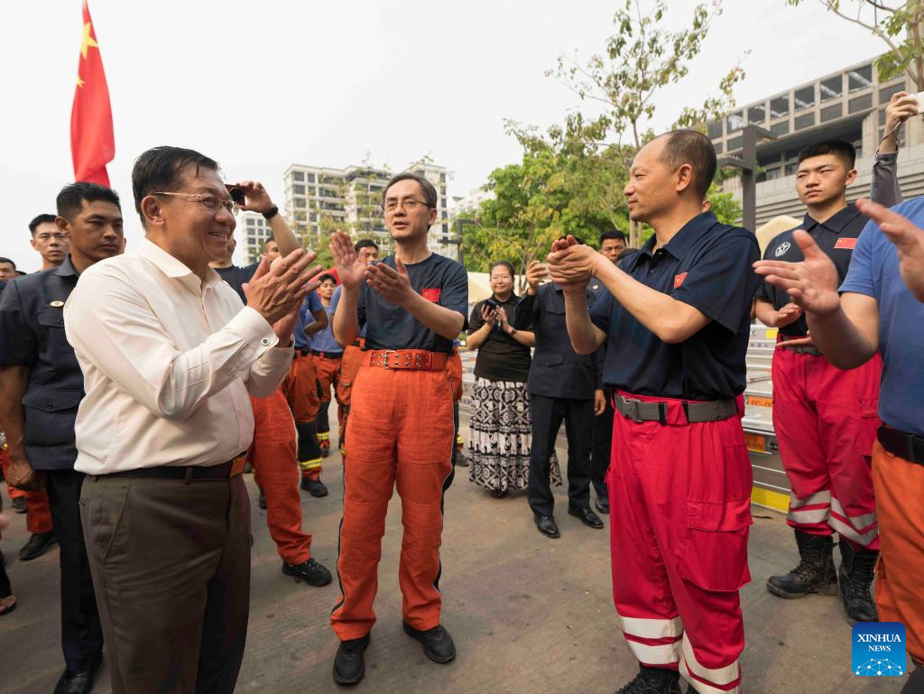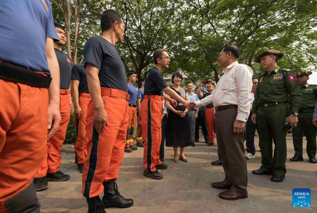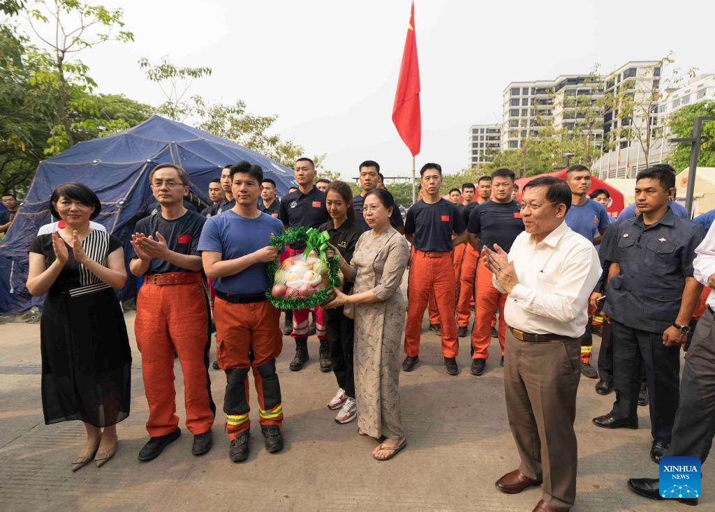 MANDALAY, Myanmar, April 6 (Xinhua) -- Myanmar's State Administration Council (SAC) Chairman Min Aung Hlaing visited the camp of Chinese rescue teams in Mandalay on Sunday, to express his gratitude to all members of the China Search and Rescue Team, the China International Search and Rescue Team, and a rescue team from China's Hong Kong for their full-force disaster response in Myanmar following the 7.9-magnitude earthquake.