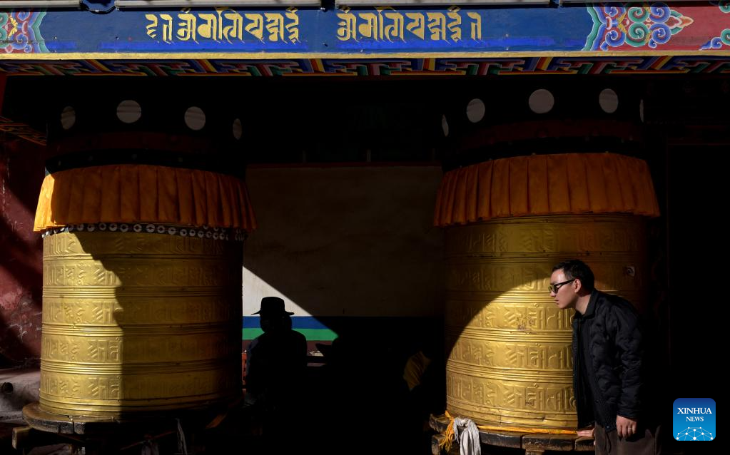 A pilgrim spins a prayer wheel at the Jiana mani stone mound in Yushu City, Yushu Tibetan Autonomous Prefecture, northwest China's Qinghai Province, April 6, 2025. The Jiana mani stone mound is a cultural relic under national protection. The mound is composed of billions of mani stones and used by local people when they hold prayers' wheels and mutter the six-syllable prayer to observe their daily ritual. (Xinhua/Zhang Long)