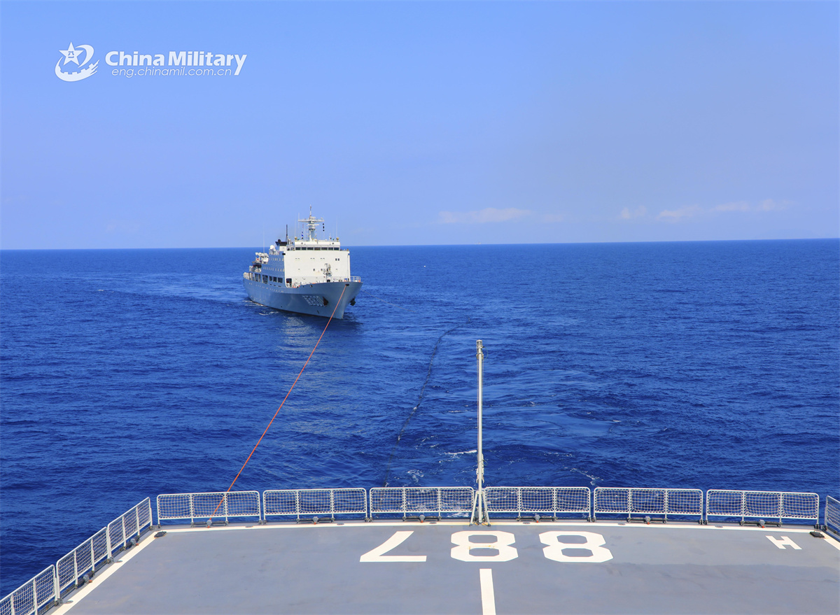 Comprehensive supply ship Weishanhu (Hull 887), attached to a naval service group under the Chinese PLA Southern Theater Command, steams at sea during a recent maritime maneuver and replenishment training exercise in the South China Sea. (eng.chinamil.com.cn/Photo by Wu Huanqing)