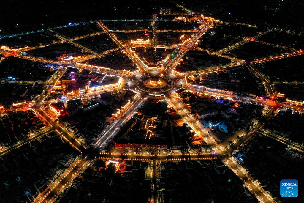 An aerial photo taken on Jan. 2, 2021 shows a night view of Tekes County in Ili Kazak Autonomous Prefecture, northwest China's Xinjiang Uygur Autonomous Region.