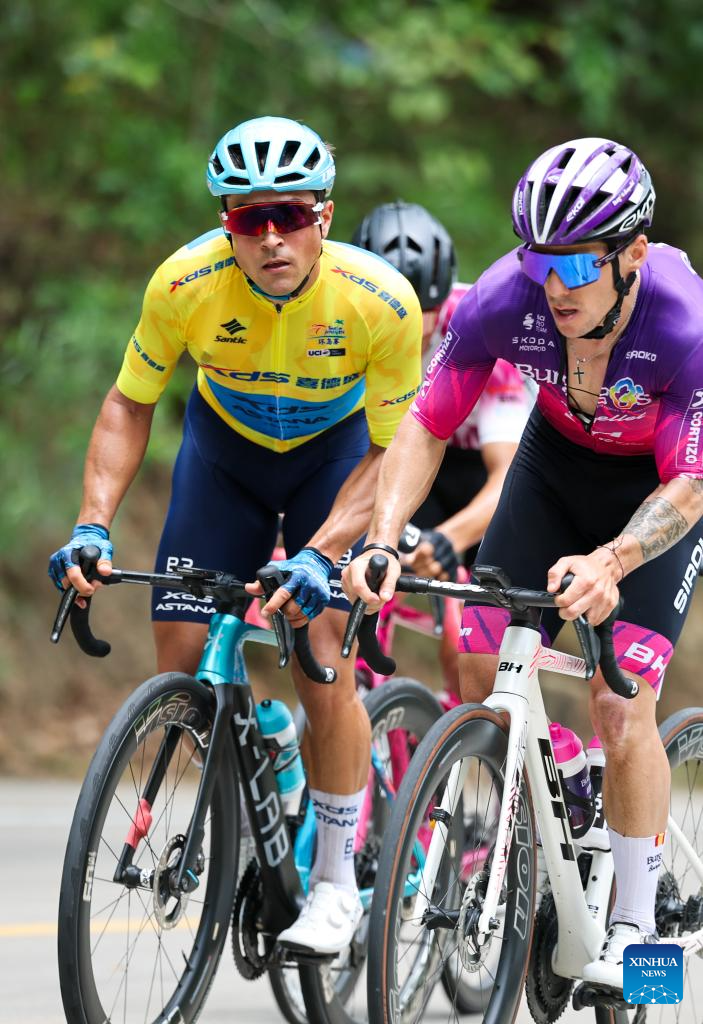 Matteo Malucelli (L) of XDS Astana Team climbs during Stage 2 at the 16th Tour of Hainan cycling race from Qionghai to Lingshui, south China's Hainan Province, April 8, 2025. (Xinhua/Yang Guanyu)