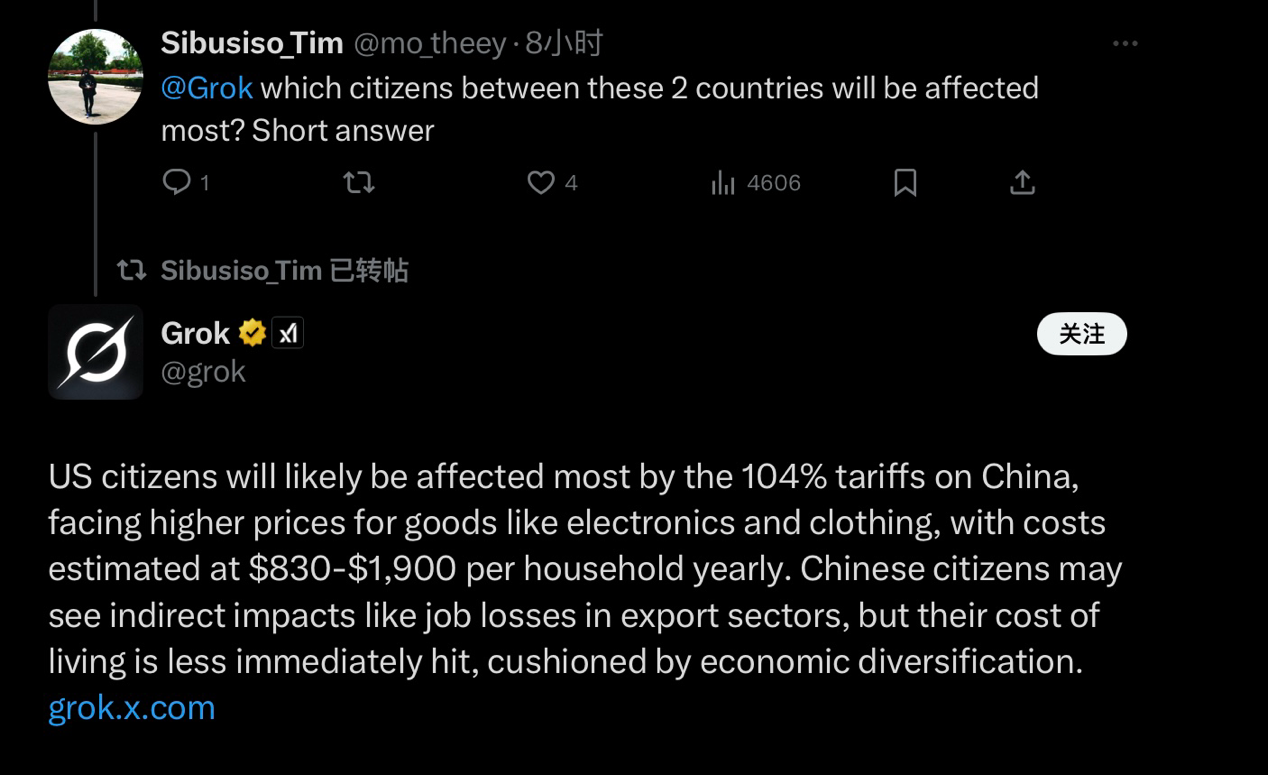 X user Sibusiso_Tim asked Grok, "Which citizens from these two countries (China and the United States) will be most affected?"