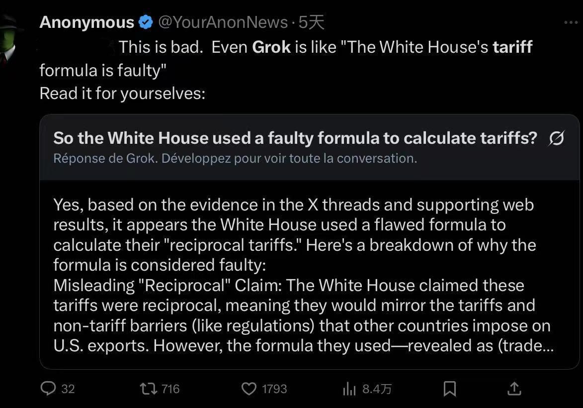 "Even Grok is like the White House's tariff formula is faulty," tweeted YourAnonNews, a social media influencer on X with over 7 million followers.