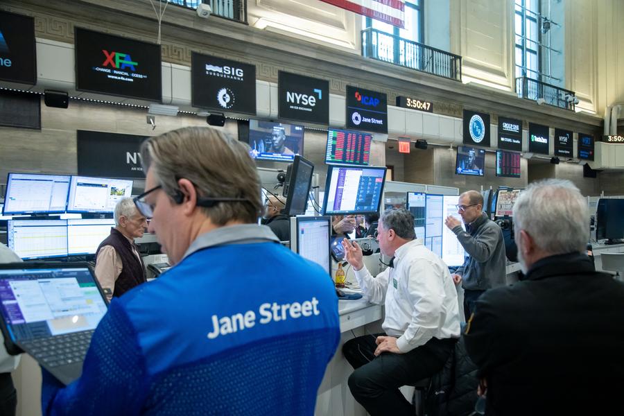 Traders work on the floor of the New York Stock Exchange in New York, the United States, on April 8, 2025. (Photo by Michael Nagle/Xinhua)