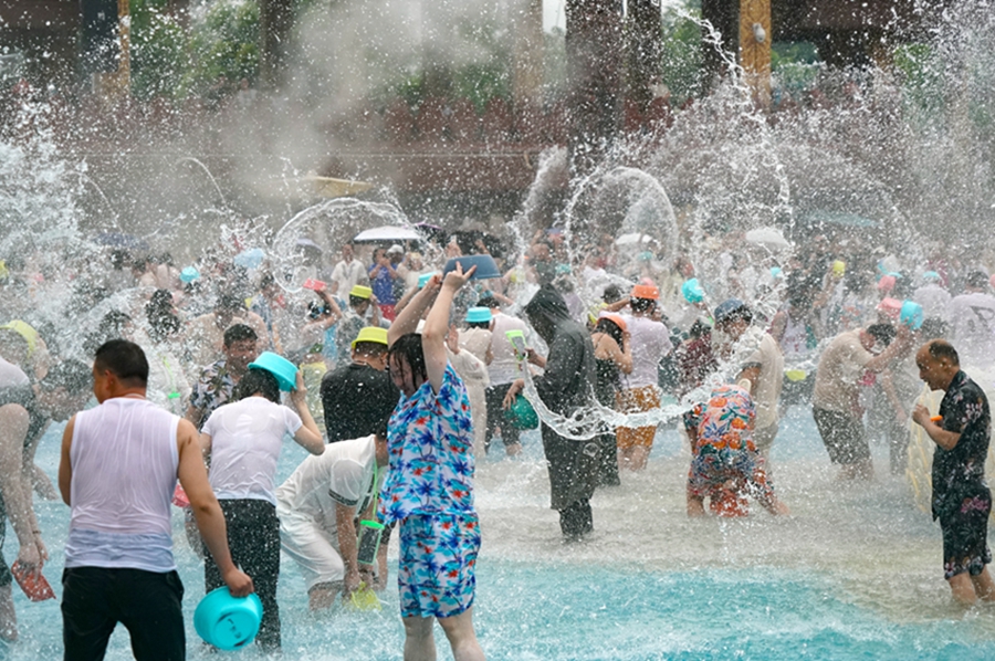 Tourists enjoy splashing water in Xishuangbanna, SW China's Yunnan