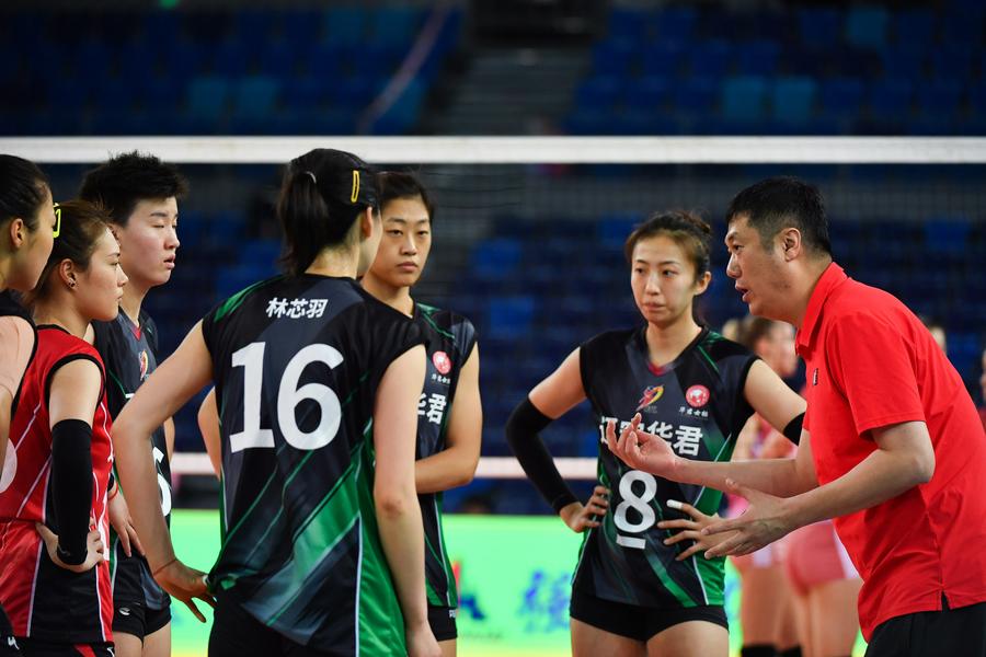 Zhao Yong (1st R), then-head coach of Liaoning, gives instructions during a 2020-2021 Chinese Women's Volleyball Super League match against Guangdong in Jiangmen, south China's Guangdong Province, Dec. 4, 2020. (Xinhua/Liu Dawei)